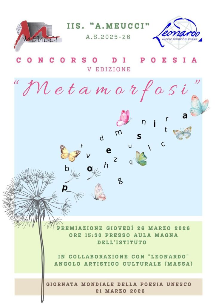 In occasione della Giornata mondiale della Poesia istituita dall’UNESCO, l’Istituto “Antonio Meucci” di Massa, diretto dalla Dirigente Scolastica Prof.ssa Anna Sparagna, in collaborazione con “Leonardo – Angolo Artistico Culturale di Massa, ha organizzato, come ogni anno, un Concorso di Poesia sul tema “Metamorfosi” destinato alle alunne e agli alunni dell’istituto.